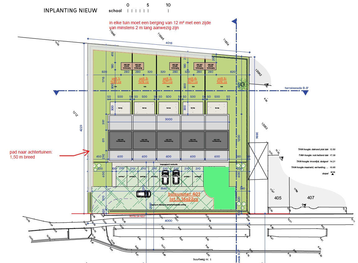 Achteraan de woningen ligt een privatieve tuinzone, bereikbaar via een pad van 1,5 meter breed. In elke tuin is standaard een berging van minstens 12 m² voorzien.
