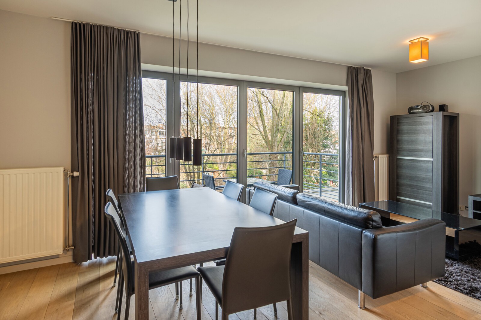 De leefruimte baadt in het natuurlijke licht dankzij de grote raampartijen die uitgeven op het ruime terras aan de achterzijde. Hier geniet u in alle rust van een open uitzicht en een groene omgeving. De leef- en eetkamer sluiten harmonieus aan op de volledig uitgeruste open keuken, voorzien van kwalitatieve toestellen, voldoende kastruimte en een tijdloos design.